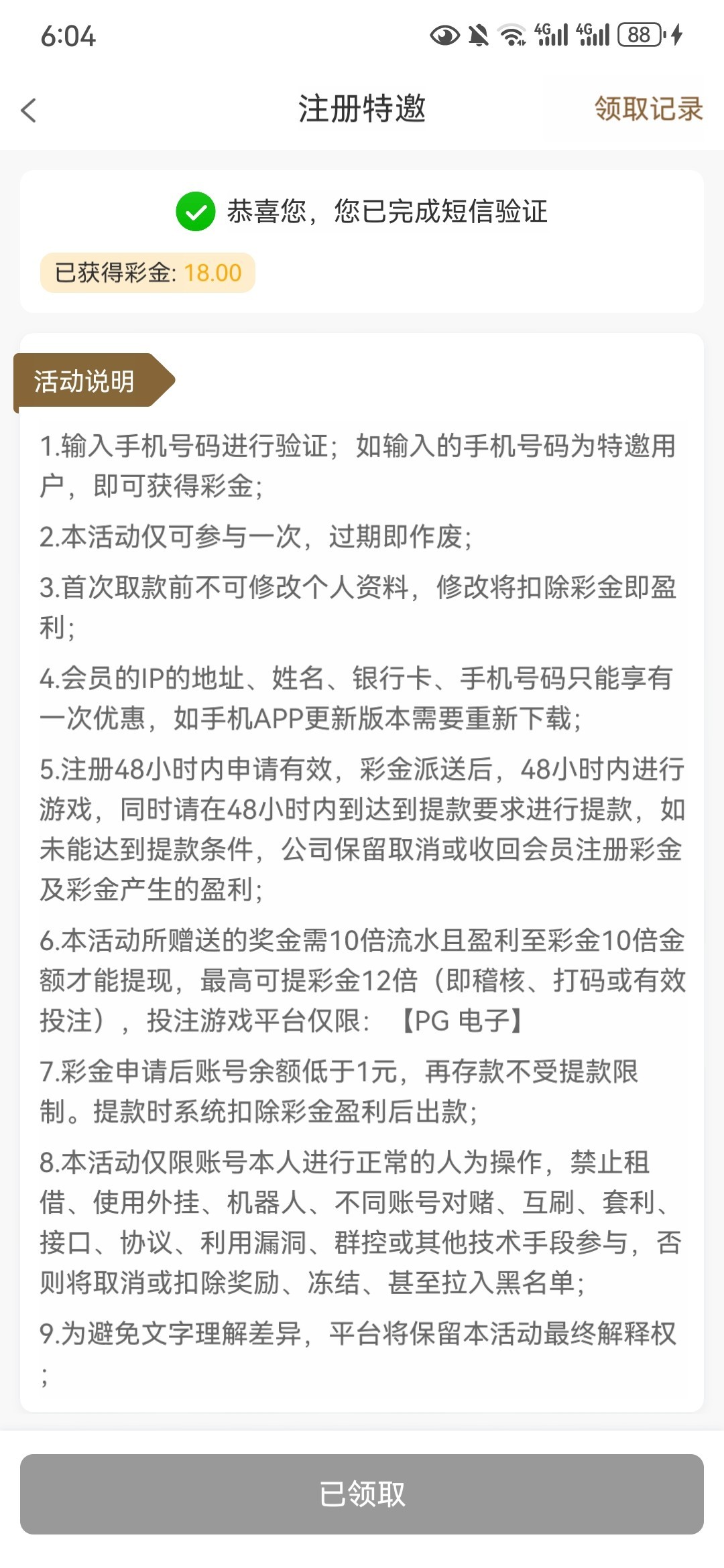 没有收到短信也没有接到电话,直接下载app注册完善信息,领取了18元彩金,没打出来,兄弟们可以试试